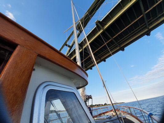 Beim Auslaufen aus Kalmar wird uns die schöne Kulisse richtig bewusst, beim Einlaufen hast du dafür keinen Blick. Beeindruckend ist auch die Ölandbrücke mit 36m Durchfahrtshöhe.
