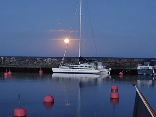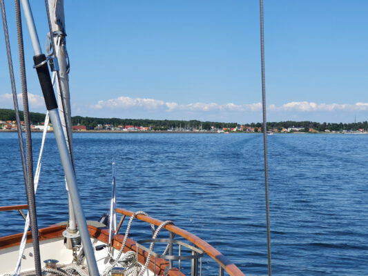 Kein Sturm, glatte See. Es sind nur 14 sm und bei schwachem Wind dauert halt die Segelei länger. Aber es ist ein sehr entspannter Tag mit viel Sonnenschein. In Klintholm wird sehr lecker gegessen und der entspannte Tag klingt auf dem Oberdeck langsam aus.