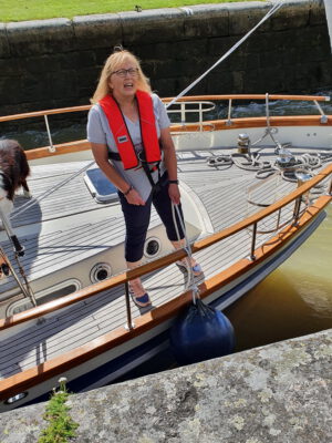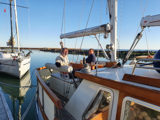 Das Bergen des Besans macht mir Probleme, die Hälfte des Segels ist noch oben und es geht nicht weiter! Sch…, kurz vorm Hafen und Giselas Herzschlag geht schon höher. Ein Gefummel und Gedrücke, Tanz um den Baum und dann kommt Gisela und sagt: „Da ist ein Knoten in der Bergeleine, siehst du das nicht?“ Kriegt man dann doch innerlich einen roten Kopf, behebt das Knötchen und schon ist alles geborgen. Um 1830 sind wir dann in Simrishamn längsseits fest, die Hunde können an Land und wir genießen am Abend den schönen Tag.