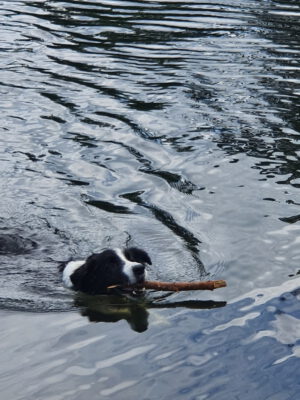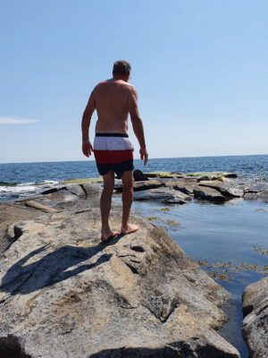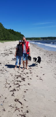 Die Insel selbst ist sehr schön, viele liebevoll gepflegte Häuschen und schöne Wanderwege. An der Inselspitze ist dann die zweite Baderunde der Hunde und meine erste angesagt, sie riechen für unsere Nasen normal.