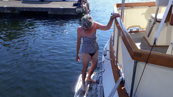 Zeitig geht es von Vadstena los, es sind ca. 20 sm bis Karlsborg. Bei südwestlichen Winden um Stärke 3 bis 4 können wir endlich wieder segeln. Die Schräglage hoch am Wind ist allerdings nicht nach Marions Geschmack, aber sie hält ohne zu murren durch. In Karlsborg selbst fühlen wir uns nicht richtig wohl, deshalb entscheiden wir uns weiter nach Forsvik zu fahren. Das war sehr gut, denn hier liegt man viel schöner und ruhiger. Wir haben den höchsten Punkt des Götakanals erreicht und köpfen am Abend eine wohlverdiente Flasche Sekt. Marion und Gisela wagen sogar einen Sprung ins abkühlende Nass.