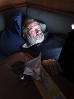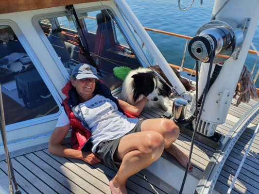 Der Wind ist schwach, aber er dreht immer weiter nach Ost, sodass wir doch ein paar Meilen unter Segel machen können. Kimi liegt die meiste Zeit draußen auf dem Oberdeck und Moritz wie fast immer im Deckshaus.
