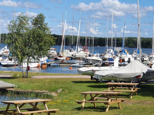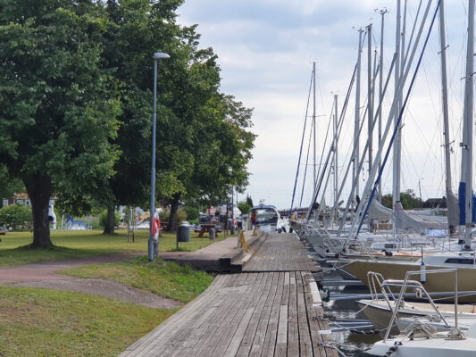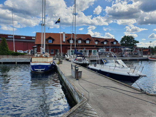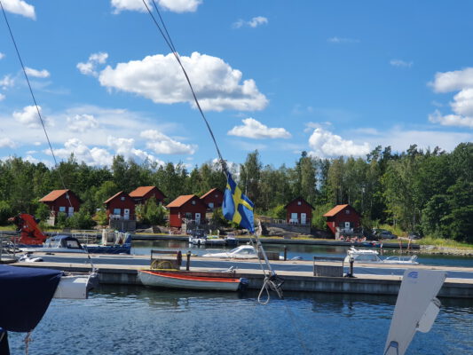 Das Ambiente der Stadsmarina hat noch viel Luft nach oben, zudem ist es durch den Straßenlärm beschallt. Nach der Waschmaschinenorgie (Gisela) und Biereinkauf (Knut) verlegen wir uns in die Marina des örtlichen Segelklubs auf der Insel Dragsö. Zum ersten Mal ist Anlegen an Boje gefordert, und da stellen wir uns ziemlich dämlich an. Der Hafenmeister ist freundlich, vor allem geduldig und letztendlich ist es vollbracht. Der Kauf eines Bojenhakens wird uns wärmstens empfohlen.