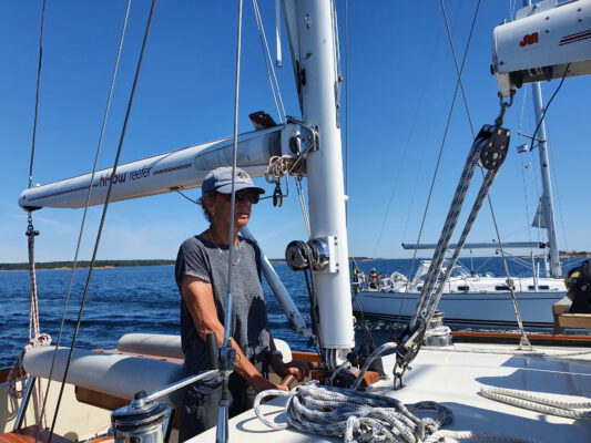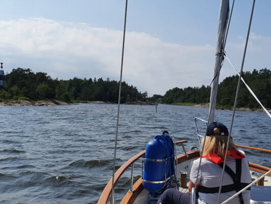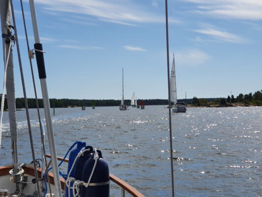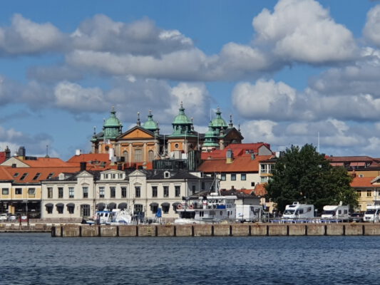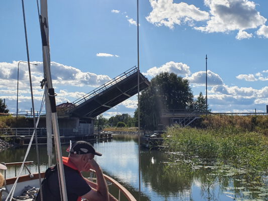 Gisela lots uns raus aus dem Hafen bei Wind aus SSE und 2 Windstärken. Wir setzen schnell Segel, aber der Wind kommt von vorn. Lambo ist kein Racer, der Wendewinkel bei Schwachwind ist 100°, keine Höhe zu machen. Wir hangeln uns halt irgendwie weiter, dann dreht der Wind Richtung Ost und es geht etwas besser voran. Kurz vor der Drehbrücke zum Westfjord Karlskrona bergen wir die Segel und fahren den Rest bis Karlskrona unter Motor.
