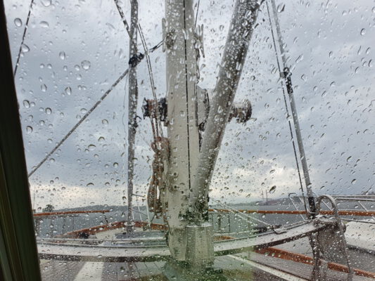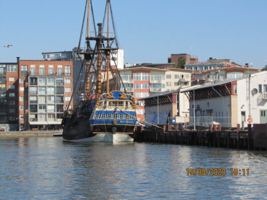 Nachdem es in den letzten Tagen im Hafen bis zu 8 Windstärken gab, ist es heute am Morgen erträglich. Draußen sollen nach Vorhersage 4, in Böen 5 blasen, kommt aber aus Südwest. Ist zwar kein schöner Wind, weil unser Kurs hauptsächlich 20° sein wird, aber es wird schon gehen. (Wenn Windrichtung und Kurs nahezu übereinstimmen, rollt das Schiff von einer Seite auf die andere. Kann einem speiübel werden.)