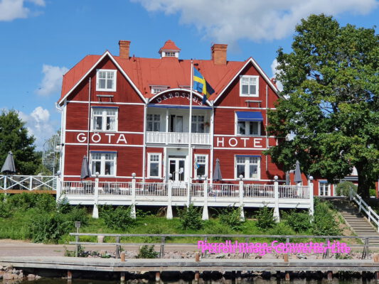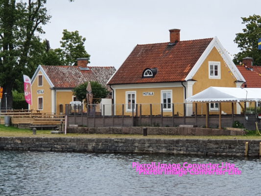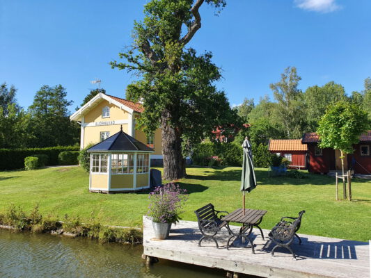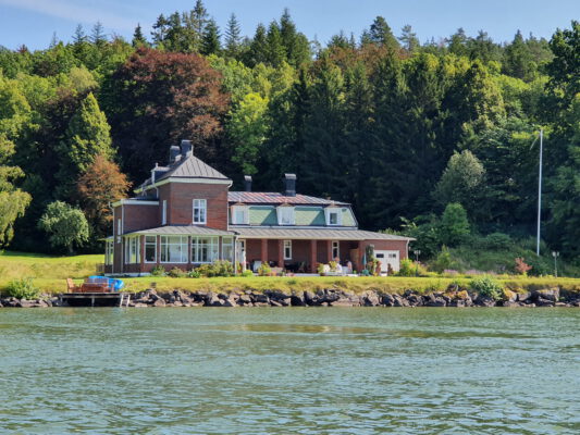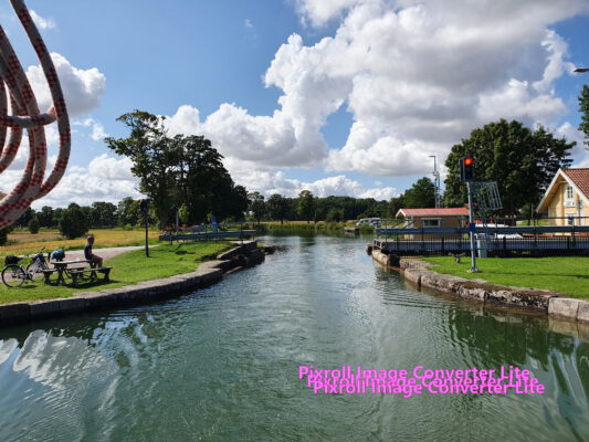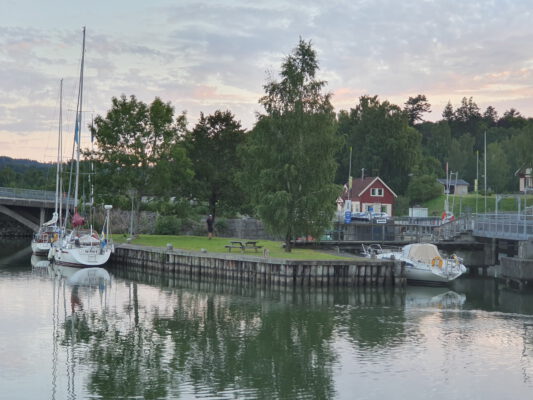 Abgesehen von Frachter Begegnungen und schöner Landschaft mit zum Teil tollen Häusern verläuft die Reise auf dem breiten Götakanal ohne besondere Ereignisse bis wir am Abend in Lilla Edet sind.