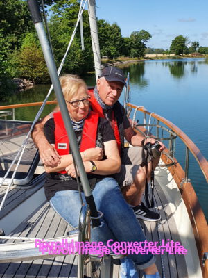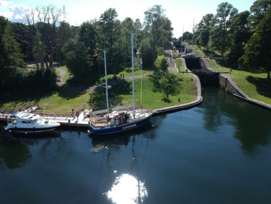 Nach einem kräftigen Frühstück geht es weiter auf dem Götakanal. Man sollte meinen, mit 4 Paar Augen kann dir nichts passieren, aber nach der Schleuse sind alle irgendwie beschäftigt und wir setzen auf. Nach Badehosen Einsatz, drei aneinander gebundenen Festmachern, Muskeleinsatz, Motor vor und zurück sind wir glücklich nach einer ¾ Stunde wieder frei. Der Rest des Tages verläuft dann ohne weitere Probleme. Ralf findet sogar Zeit mit seiner Drohne einen Rundflug von fahrendem Schiff zu machen, die Landung forderte sein ganzes fliegerisches Können. Bei der ersten Abwärtsschleuse in Totorp am Ausgang des Viken ist nur ein Höhenunterschied von 20 cm zu überwinden. Wahrscheinlich deshalb muss ein Crewmitglied auf einer Seite hier selbst Hand anlegen, die andere Seite bedient der Schleusenwärter.