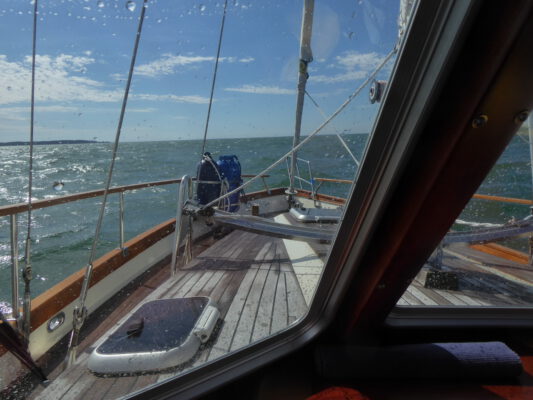Der Wind hat etwas abgenommen und wir wollen weiter, auch wenn Wellenhöhen 1,5m vorhergesagt sind. Da der Wind aber aus SW (Südwest) kommt und wir nach ESE wollen, sollte es keine Schwierigkeiten geben.