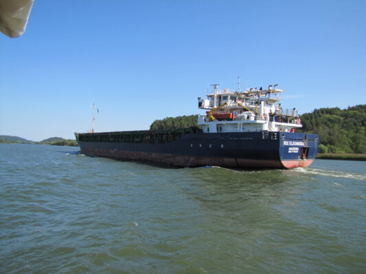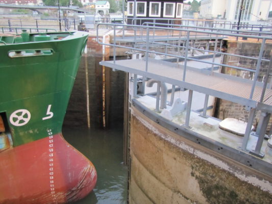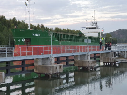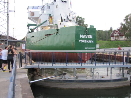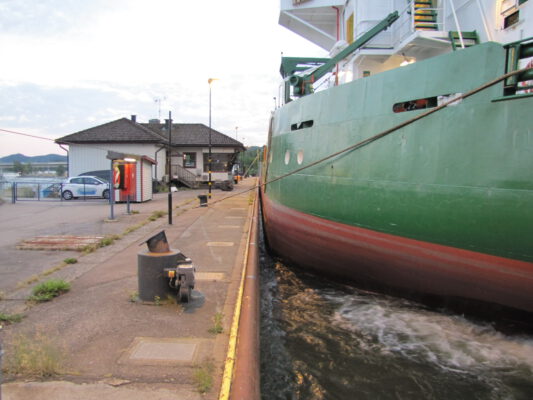 Am Abend in Lilla Edet können wir dann noch das Schleusen eines Frachters beobachten. Man kann kaum glauben, dass dieses Schiff in die Schleuse passt. Es ist wirklich kaum Luft ringsum.