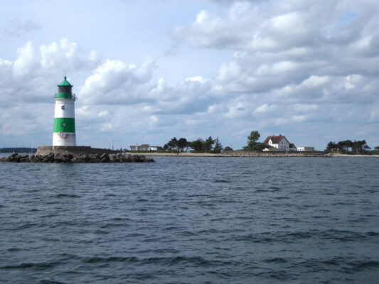 Irgendwann mussten wir eine Wende fahren, um Höhe zu gewinnen. Der Wendewinkel der Lambo ist ca. 100°, erschütternd. Aber nach 1,3 sm konnten wir an der Untiefe vorbeisegeln und hatten bis vor der Rinne nach Samsö 27 sm gesegelt. Durch die Rinne geht es voll gegen an, also Motor an und Segel runter. Der Skipper denkt: „für die halbe Stunde motoren räume ich die Fallen und Schoten nicht auf, wir segeln gleich weiter“. Hätte auch geklappt, wenn sich nicht das unbelegte Großfall in den Mast verabschiedet hätte. Große Frust.