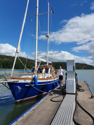 Erste Handlung an diesem Morgen ist das Anliegen an der Tankstelle in Stegeborg. Als der Dieseltank dann wieder voll ist, sind 345 Liter durch den Zapfhahn gesprudelt. Wir sind 100 Stunden motort und das ist kein schlechter Wert.
