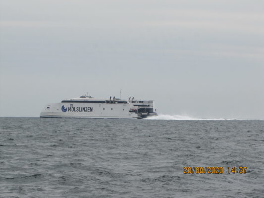 Der Tag versprach verheißungsvoll zu werden. Nachdem wir die Spitze südlich Grenaa umrundet hatten, konnten wir Segel setzen und haben uns dann an einem riesigen Windpark (111 Windräder) entlang geschummelt. Manchmal braust eine Schnellfähre mit 36 kn an dir vorbei, ungefähr 60 km/h.