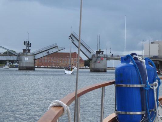 Ein Motortag. Nicht nur weil kaum Wind da ist, sondern auch der Schlängelei durch den Alssund. Auch hier erinnert viel an den Götakanal. Bevor wir am alten Holzbollwerk anlegen, müssen wir auf die Öffnung der Brücke warten. Bei Brückenöffnung drängen sich von einer Richtung 13 Boote, von der anderen 7 Boote durch die schmale Brückenöffnung.