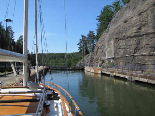 Gestern war der letzte Tag unserer Götakanal Reise. Und der Wind war kräftig, kam aber mehr oder weniger von achtern. Schnell kamen wir voran, in der Spitze zeigten die Instrumente 6,3 kn. Dafür hingen wir voll auf der Geige (die Lambo rollte von einer Seite auf die andere) und hatten zwischenzeitlich Bedenken um unsere Weingläser. Bis dahin hatten wir bereit drei Gläser zersegelt. Diesmal hatten wir keine Schäden zu beklagen.