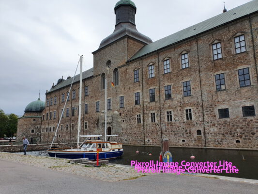 Die Hoffnung auf ein bisschen segeln erfüllt sich leider nicht. Nachdem wir aus der Hafenregion raus sind, soll unser Kurs nach Vadstena 210° sein, der Wind kommt mit 4 Bft (Windstärke, erste Wellen haben weiße Krönchen) aus Südwest, keine Chance. Für 12 sm lohnt es nicht, die Segel hoch zu ziehen, zumal eine Segelei hoch am Wind für die Frauen nicht erbaulich ist. Je näher wir Vadstena kommen, um so stärker bläst es und frischt auf 5 Bft. Wir legen im Wassergraben des Schlosses an, eine herrliche Kulisse.