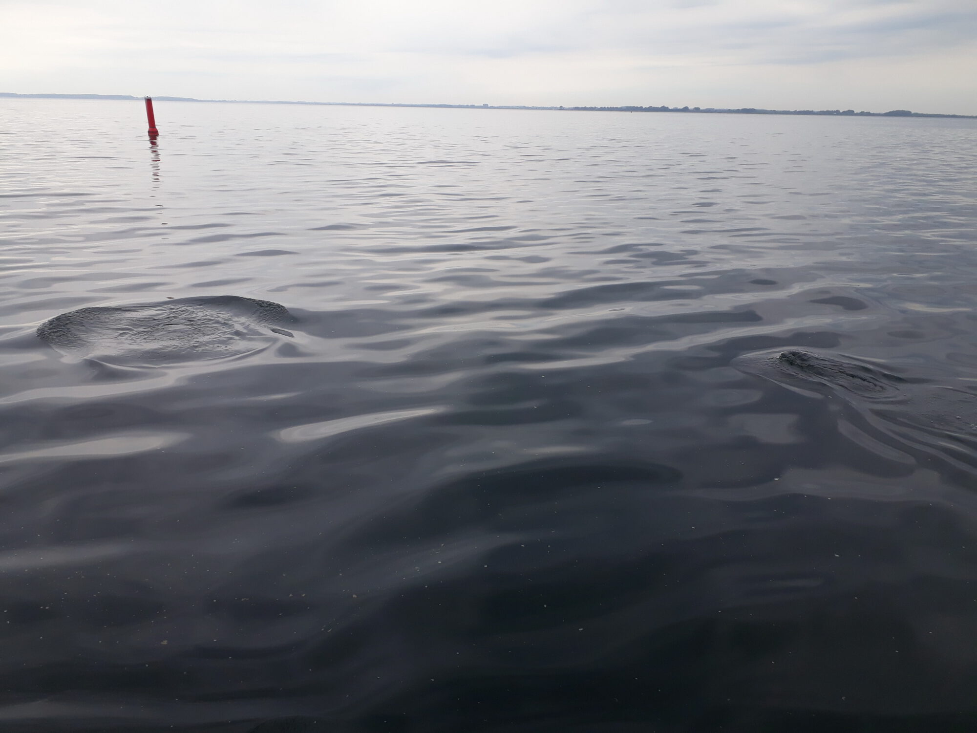 Bei unserer Schleichfahrt hatten wir jedoch ein highlight – 4 Tümmler haben uns eine ganze Weile begleitet (man kann sie auf dem Foto aber nur erahnen).