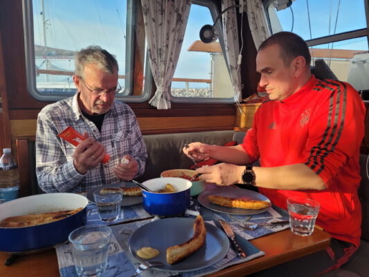 Die Hafenpromenade ist noch keine Fußgängerzone, ist halt noch Vorsaison und ziemlich kalt. Ein kleiner Abstecher zum Marineshop im Yachthafen (eine Leine war zerschlissen) brachte dann die nötige Bewegung für das Abendessen. Gespeist – besser diniert – haben wir in der Brasserie am Schloss, es war ganz hervorragend.