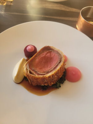 Filet Wellington und Blutorangencreme auf Milch-Vaniile-Kugeln