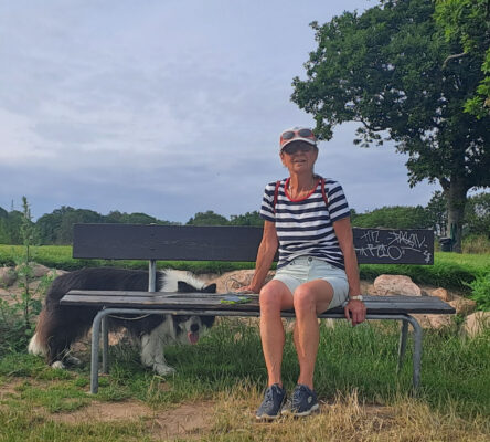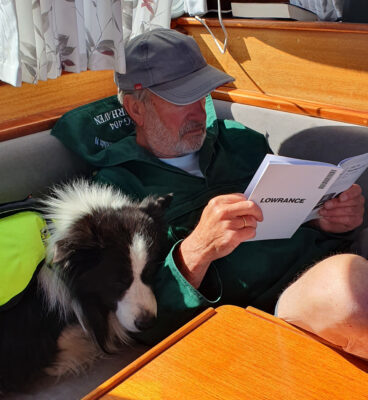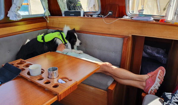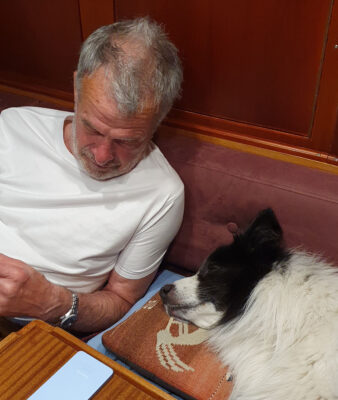 Die 14sm von Vejrø nach Omø waren ein Gedicht. Der Südwestwind mit 4 bis 5 Bft quer von Backbord, alle Segel oben und mit durchgehend 5kn war es eine Freude. Meine Crew hat sich schlafen gelegt, bei Schräglage sucht Kimi möglichst Kontakt mit Gisela.