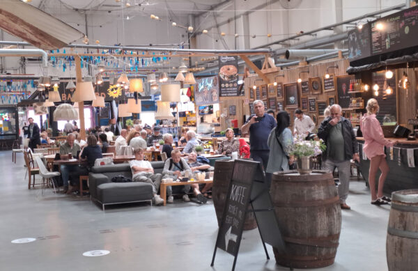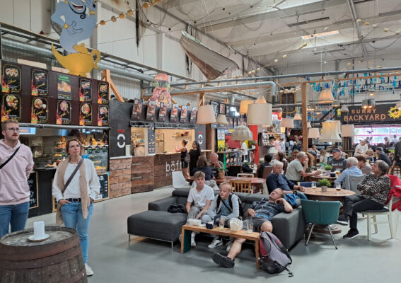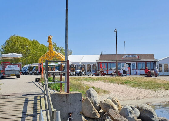 Der Hafen Klintholm ist als Zwischenstation für uns ganz brauchbar, aber es gibt keinen Kaufmann mehr, nur noch ein Kiosk. Das Restaurant hatte nur ein Menu im Angebot, 8! Gänge für 575 dkk. Ein Sandplatz mit bunten Buden und allerlei Take Aways rundete die kulinarischen Angebote ab.
