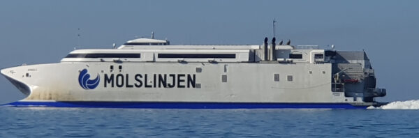 Von Marselisborg nach Ebeltoft sind es nur 21sm, aber der Wind war schwach und kam von vorn. Nach 1sm und 45Min später hatten wir ein Einsehen, Motor an. Die Segel bleiben oben, stören ja eh nicht und hinter Sletterhage Leuchtturm können wir auf Kurs nach Nord gehen. Einziges Highlight sind die Schnellfähren, die mit 36kn (70kmh) an uns vorbei rauschen, erstaunlich leise.