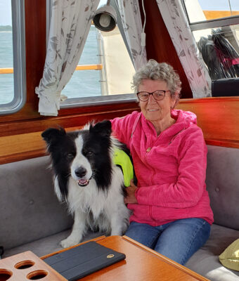 Die 14sm von Vejrø nach Omø waren ein Gedicht. Der Südwestwind mit 4 bis 5 Bft quer von Backbord, alle Segel oben und mit durchgehend 5kn war es eine Freude. Meine Crew hat sich schlafen gelegt, bei Schräglage sucht Kimi möglichst Kontakt mit Gisela.