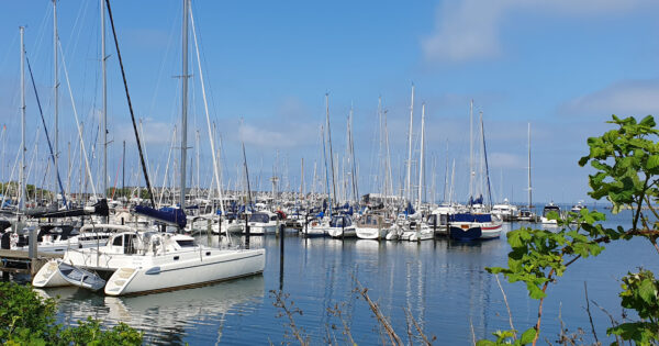 Bei achterlichem Wind steuern wir eine Box an, es geht ganz glatt rein. Nach dem Festmachen und Motor aus zeigt das Log 1,0m an. Wir sind, ohne es zu merken, auf Schlick. (Die Lambo hat einen Tiefgang von 1,6m, aber der Tiefengeber ist 60cm unter der Wasserlinie) Eine neue Erfahrung, denn hier muss man schon mit Tidenhub rechnen. Angegeben ist die Stelle übrigens mit 2,5m. Bei Niedrigwasser fällt die ganze Bucht hinter dem Hafen trocken.