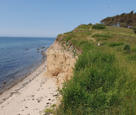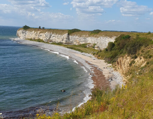 Gestern haben wir eine Wanderung zur Kirche von Højerup gemacht, 8km hin und 8km zurück. Die Kirche ist von einem Fischer gestiftet worden, der aus Dankbarkeit von der Rettung aus Seenot an der Stelle der Steilküste eine Kapelle erbauen ließ. 100 Jahre später war es bereits eine Kirche. Der Platz war nicht ganz geschickt gewählt, denn 1928 bei einem heftigen Frühlingssturm, ist erst ein Stück der Steilküste und dann der Chor der Kirche abgebrochen. 5 Tage später waren schon 20´000 Besucher da, heute ist es immer noch ein Ausflugsziel. Die restliche Kirche ist stabilisiert worden, man hat einen tollen Blick über die Ostsee nach Schweden. Die neue Kirche hat man dann vorsichtshalber 200m landeinwärts aufgebaut.