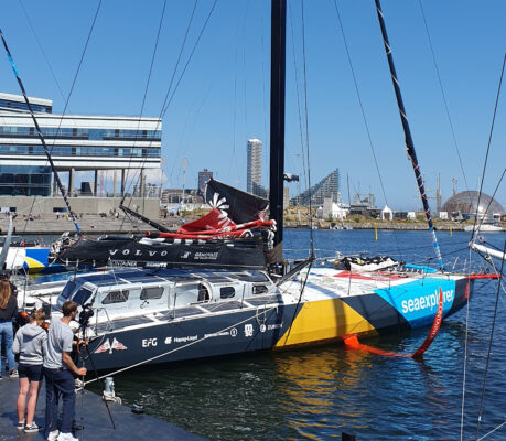 Rund um den Hafen bestimmt das Segelereignis „The Ocean Race“ das Bild. Vier Segler dieser Klasse liegen am Kai – der fünfte wurde am Nachmittag erwartet – am Donnerstag starten sie auf die Etappe nach Den Haag mit einem „Fly By“ in Kiel. Diese Maschinen haben mit unserer Lambo nur gemein, dass sie im Wasser schwimmen und Mast und Segel haben. Beeindruckend, die können bei bestimmten Bedingungen schneller segeln als der Wind weht. Es ist ein richtiges Happening, Interviews werden überall gegeben, auf großen Leinwänden spektakuläre Videoclips gezeigt, sogar für Kinderbespassung ist gesorgt.