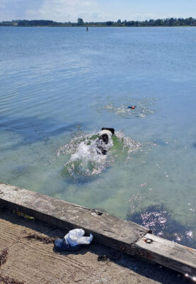 Wenn der Hafen Omø bumsvoll war, Lundeborg war die Steigerung. Um kurz vor 14 Uhr gab es keine freie Box mehr, anlegen war nur noch im Päckchen möglich. Es gibt immer wieder Segler, die sich lautstark weigern, an ihrer Seite für eine Nacht anlegen zu lassen. Wir haben neben einem netten Deutschen festmachen können. Das von Bord kommen ist aber nicht ganz einfach, wenn du einen zappeligen Hund über drei Relings hieven musst.