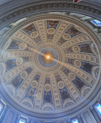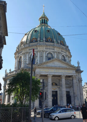 Die Frederikskirken, so der offizielle Name, wurde von Frederik V. als neobarocke Kirche in Auftrag gegeben und 1749 war Baubeginn. Der König bestand auf norwegischem Marmor, was die Kosten aber so hoch trieb, dass der Weiterbau gestoppt wurde. Erst 120 Jahre später wurde der Bau durch den Bankier Frederik Tietgen mit dänischem Standstein fertiggestellt. Die Kuppel, inspiriert vom Petersdom in Rom, mit einem Durchmesser von über 30 Metern ist die größte in Scandinavien.